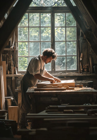 Senior craftsman smoothing a plank of wood using a chisel in his old fashioned carpentry workshop, surrounded by wood shavings and tools, bathed in natural light