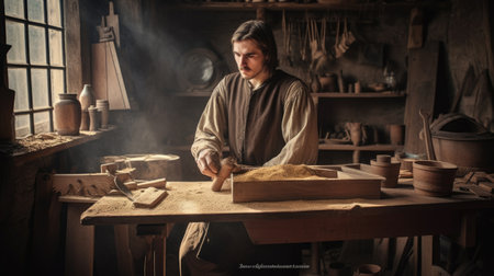 Sunlight streams through windows, illuminating a woodworker's bench with tools, capturing the essence of craftsmanship. Download this timeless scene. Generated A.I.