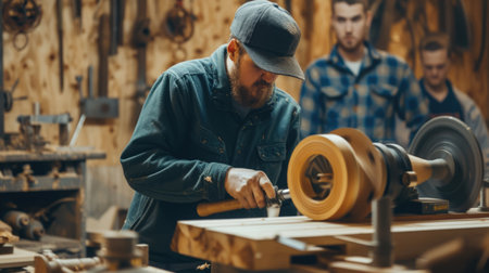 A skilled woodworker demonstrates lathe techniques to a group of engaged young apprentices in a well-equipped workshop. AIG41