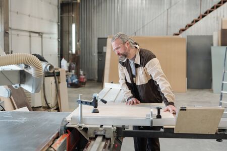 Senior experienced carpenter in plaid shirt putting pine wooden board in thickness planer on workbench
