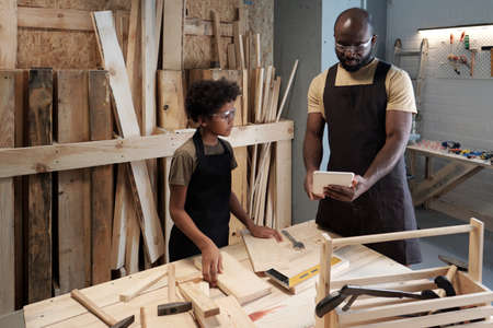 Portrait of African-American father teaching son carpentry while working together in woodworking shop