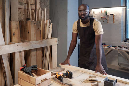 Portrait of adult African-American man in carpentry workshop looking at camera with confidence