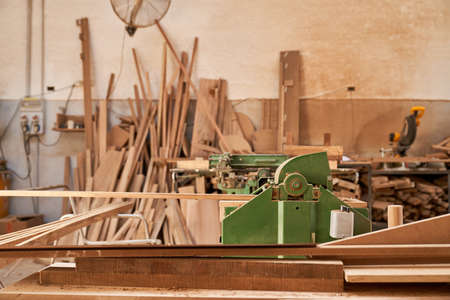Carpentry workshop with a lot of wood and a machine for wood processing