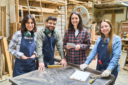 A group of diverse workers, both young and older, working together in a lumberyard. They demonstrate teamwork, collaboration, and skills development in a workshop environment, highlighting mentorship and apprenticeship.