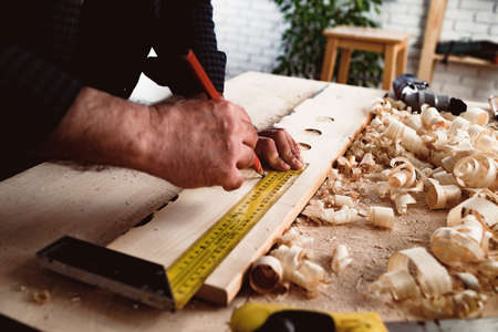 Carpenter measuring wooden board with ruler with scale in workshop. Joinery work on the production of wooden furniture. Small Business Concept