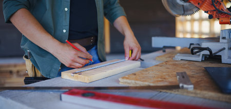 Carpenter measuring wooden planks and making marks with pencil, diy eco-friendly homes concept.