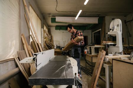 DIY woodworking and furniture making and craftsmanship and handwork concept. Carpenter working on woodworking machines in carpentry shop. Young man working as carpenter and taking wood stock.