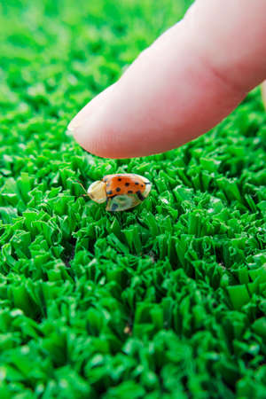 Ladybug yellow in nature in Siberia, Ladybug beetles. Calvia quatuordecimguttata.