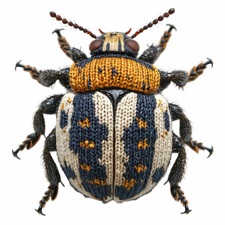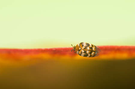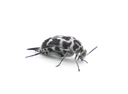 Isolated on white background the small varied carpet beetle, Anthrenus verbasci. Home and storage pest. The larva of this beetle is a pest of clothes made of natural animal raw materials - leather, wool, hair