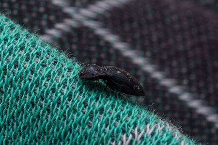 Close-up of dead black beetle (Capnodis tenebrionis) on flooring in house. Pest control concept. Extermination.