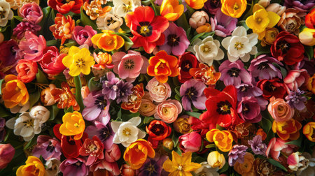 Vibrant floral pattern featuring diverse colorful flowers in various shades, ideal for spring themes and design projects, symbolizing beauty and nature