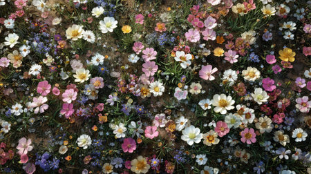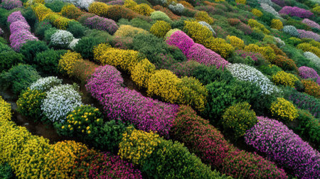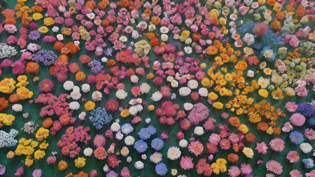 Experience the breathtaking beauty of a vibrant array of flowers in an aerial view, showcasing stunning colors and delicate patterns in a serene garden setting.