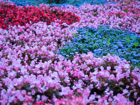 Selective soft focus on colourful field of flowers. Floral background of red, blue and pink flowers close up. Colourful floral pattern closeup.