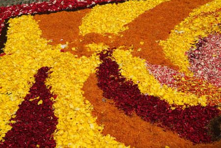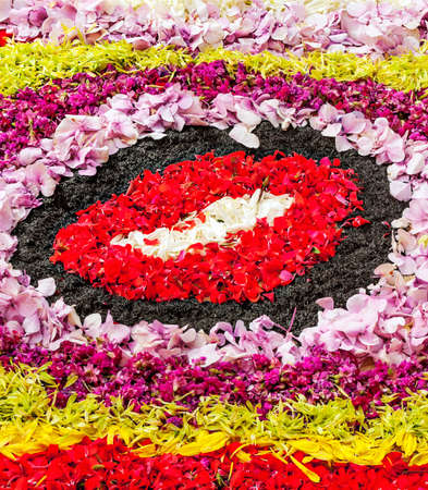 Abstract multicolor designs made of flowers, stones or sand composition, during religious ceremony in Spain. Text space