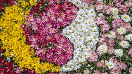 Beautifully arranged yin and yang pattern made entirely of flowers, a delicate and colorful symbol of peace and balance.