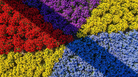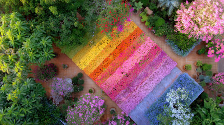 Experience the breathtaking beauty of a vibrant flower garden from above, showcasing a stunning array of colorful blooms and lush greenery in full spring splendor.