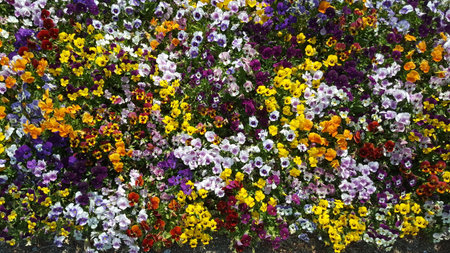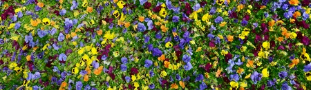 Multicolor pansy flowers or pansies as background or card. Field of colorful pansies with white yellow and violet pansy flowers on flowerbed in perspective.