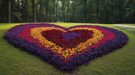 A breathtaking flower installation in the shape of a heart, made entirely of multicolored petunias at Pakruojis Manor in the Baltic States.