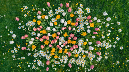 A beautiful overhead view of a colorful floral arrangement featuring tulips, daffodils, and daisies on lush green grass, perfect for spring themes.
