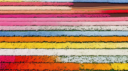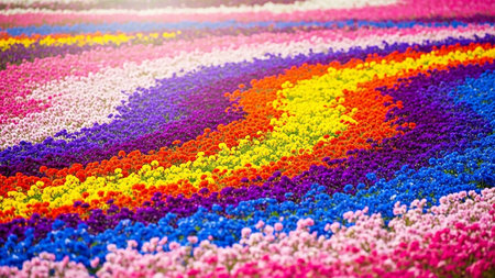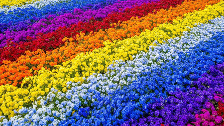 Category: showing extensive field of blooming flowers arranged in vibrant rainbow stripes of purple blue red orange yellow and white petals creating a colorful...