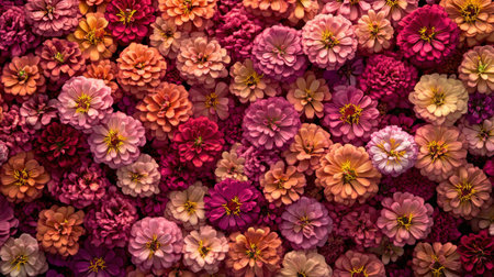A stunning array of zinnia flowers showcases vibrant shades of pink, orange, and purple. Perfect for floral enthusiasts, this colorful display brings joy and beauty to any setting.