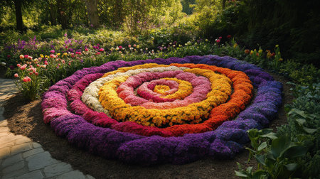 A beautiful, colorful spiral sculpture crafted from flowers is prominently displayed in a serene garden.