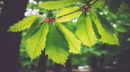 Close-up capturing sunlit green beech leaves hanging from branches, exhibiting their intricate vein patterns and serrated edges. A blurred bokeh background enhances the depth and focus.