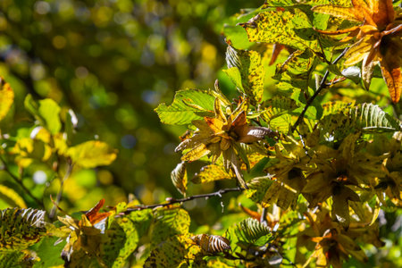 Branch of a hornbeam Carpinus betulus with drooping inflorescence and leaves in autumn, selected focus, narrow depth of field, copy space in the blurry background.