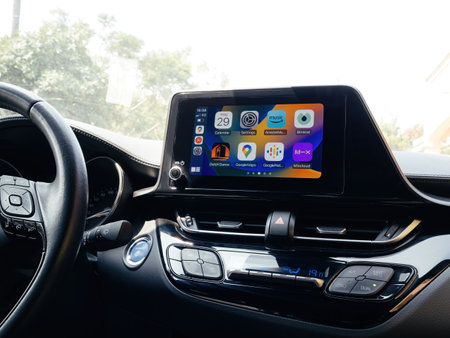 Mallorca, Spain - Jun 29, 2023: Interior of a car showing the steering wheel and a dashboard screen with Apple CarPlay activated showing apps icons