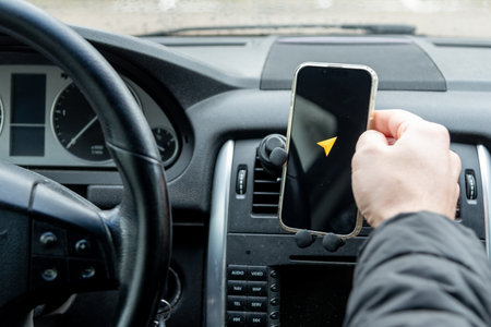 Man using mobile phone for gps tracking in car trip, close up of man using everyday technology
