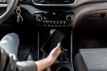Mockup of a smartphone with an empty screen used by a woman while driving the car. Interior view of a brand new car. Car and mobile phone concept.