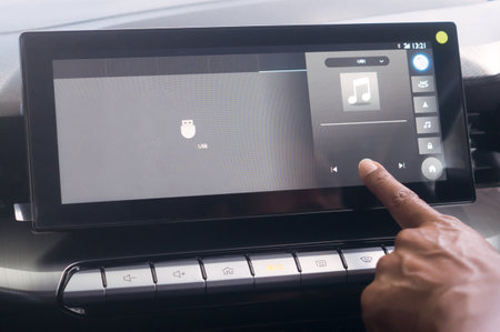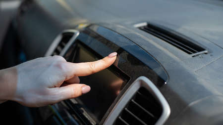 Close up photo, driiver's forefinger is touching flat screen player to turn on music while driving super modern car. Concept of using high technology accessories in modern car in vintage color tone.