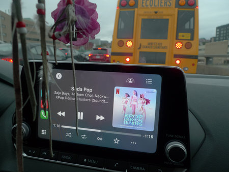 CHIANG MAI, THAILAND - MAR 28, 2021: Apple CarPlay starting up on an iPhone X connected to a new car