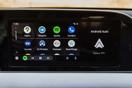 MOSCOW, RUSSIA - FEBRUARY 05, 2022 Android Auto on the screen. homescreen. modern car. Interior close up. Car media close up view. homescreen.