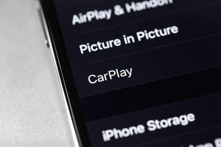 CarPlay setting on display iPhone, macro. CarPlay is an Apple system that allows you to connect your iPhone to a multimedia-adapted vehicle. Moscow, Russia - January 23, 2021