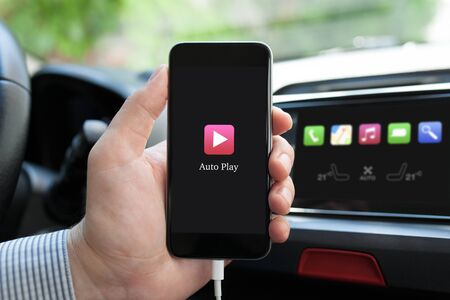man hand in car holding phone with app Auto Play on the screen and on multimedia system