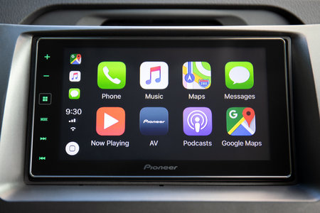 Alushta, Russia - September 20, 2018: Car Play on the multimedia system with Google Maps on the screen. Apple Car Play was created and developed by the Apple inc.