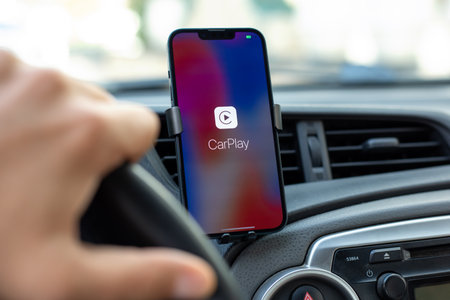 Closeup mans hand holding Iphone with Apple carplay logo on the screen in the car, September 2020, Prague, Czech Republic.