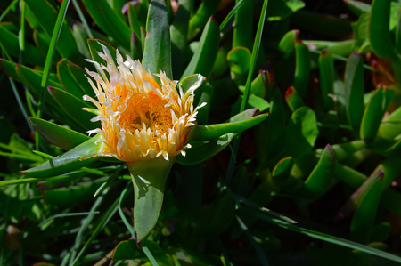 Carpobrotus edulis, a succulent plant, creeping, native to the Cape region in South Africa in regions with similar climate, such as the Mediterranean and parts of Australia and California, escaped the control human and has become an invasive species
