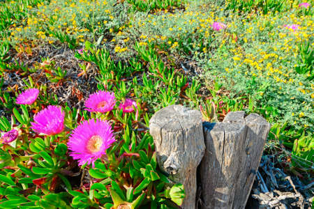 Detail of coastal plants with spring pink and yellow flowers
