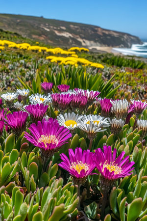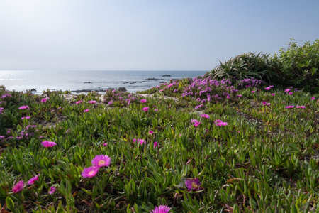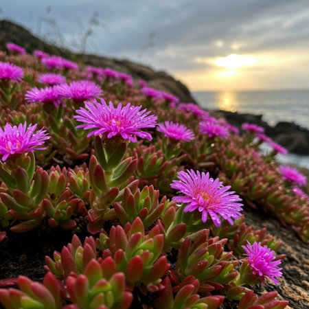 Vibrant wildflowers in pink hues, creating colorful carpets on coastal bluffs with ocean views