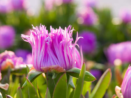 Side plan of a Carpobrotus edulis of the genus Carpobrotus, it is a typical plant of the dunes in beaches and coastal areas that presents a multitude of purple flowers