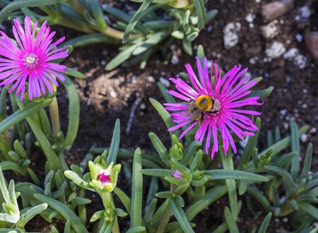 Honey bee on a Hottentot-fig flower. It is a ground-creeping plant with succulent leaves in the genus Carpobrotus, native to South Africa. It is also known as, ice plant, highway ice plant, pigface and the sour fig.