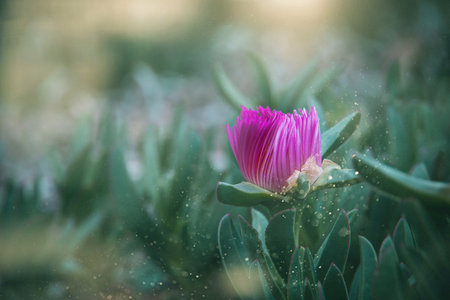 beautiful spring delicate purple flower ice plant among green leaves close-up forming the background