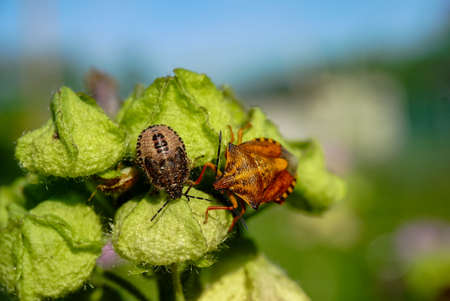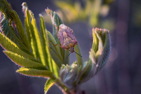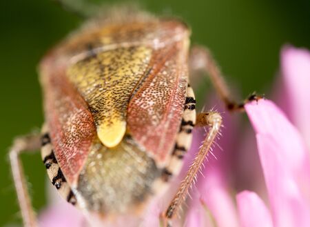 beautiful shield bug. wildlife. colorful detailed macro photo of an insect. close-up. space for text. screensaver. bokeh. chinch. bug. beetle. Pentatomidae. Carpocoris purpureipennis.