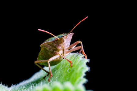 Green shield bug Palomena prasina sitting on a sheet on a black background.