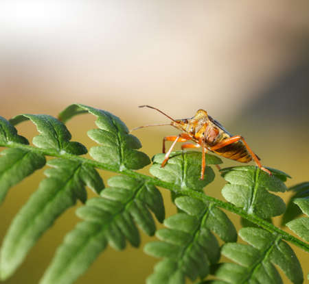 Macro low angle side view of forest bug (Pentatoma rufipes) on green fern leaf over forest background