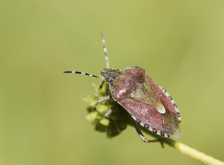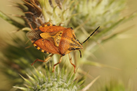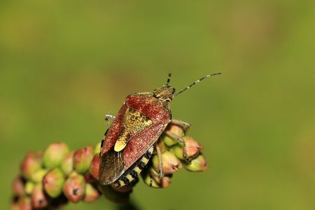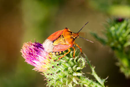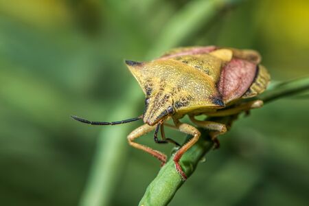 Detailed closeup on a colorful Medtierranean red shield bug, Carpocoris pudicus