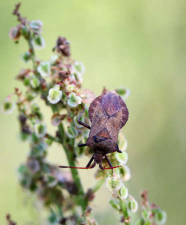 Coreus marginatus large bed bug perched on Armeria on unfocused green background and natural light