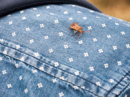 cute brown dock beetle resting on a shirt shoulder; England; UK